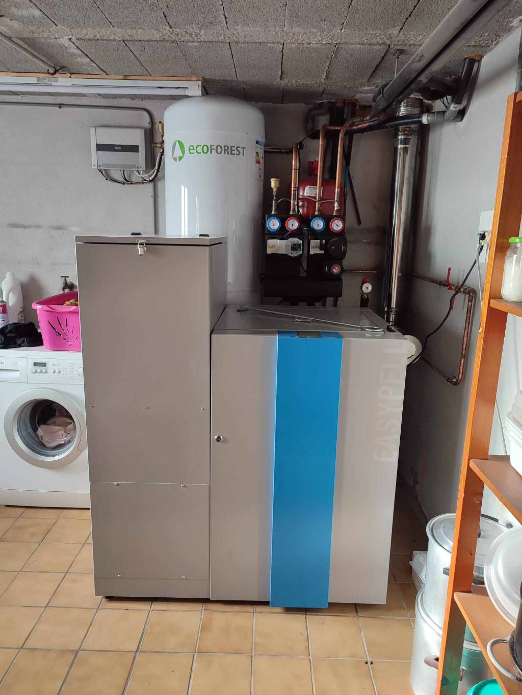 Ayant la production d'eau chaude avec son ancienne chaudière nous lui avons installé le ballon ECS Hybride de chez ECOFOREST qui nous permet de chauffer l'eau soit avec la chaudière à granules soit avec l'électricité grâce à un 2eme serpentin de chauffe à l'intérieur du ballon.