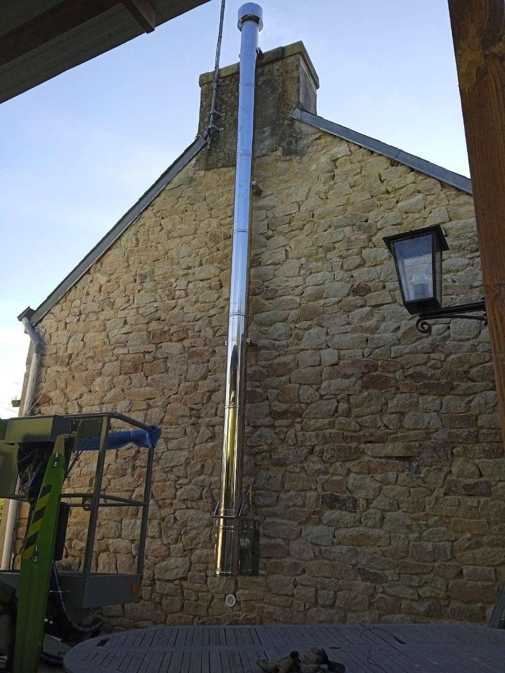Pour la mise en place de ce conduit extérieur une nacelle a accompagné nos installateurs pour un gain de temps et un travail en sécurité.