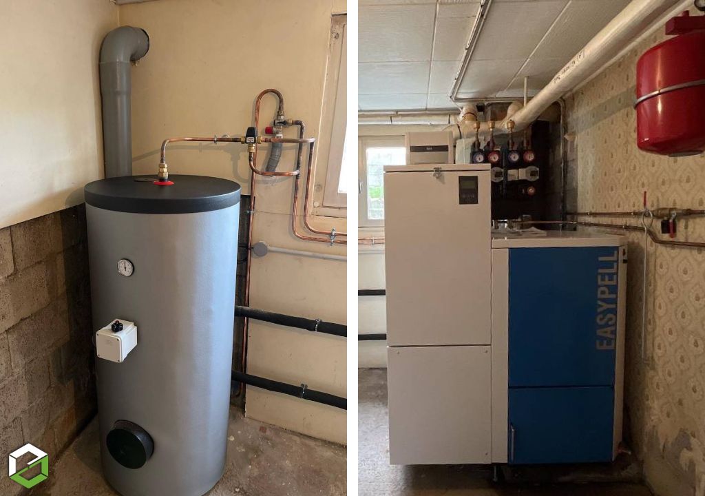 - Installation technique : Nos techniciens experts, Hervé et Gabin, ont assuré la pose d’une chaudière à granulés Easypell. L'installation comprend une sortie de fumée entièrement neuve et conforme aux normes en vigueur.